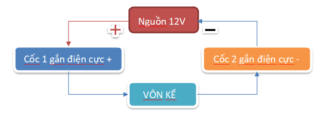 Sử dụng nguồn 12V ổn định, cắm 2 cực dương và âm vào 2 điện cực ở 2 cốc chứa dung dịch điện li riêng biệt, sử dụng vôn kế để đo hiệu điện thế ở 2 cốc dung dịch (chỉ cho đầu dò chạm vào phần dung dịch, không chạm vào phần kim loại của điện cực)